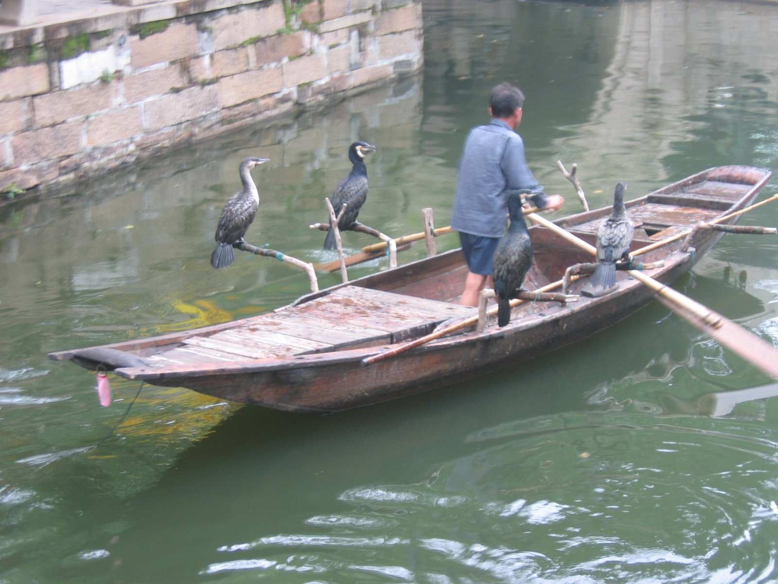 "Man's best friend" -- the dog? Not to a member of the Japanese guild of Master-Cormorant-Fisherman, whose ancestors have relied for 1300 years upon feathered assistants to fish for the emperor's imperial dinner table. Young sea birds are captured from ocean cliffs of Ishihama, massaged and hand-fed. For the next fifteen years, the birds will swim underwater, catching more than a pound of fish daily from the Naragra river, often under the admiring gaze of tourists. Each fishermen uses up to a dozen birds with hemp-string tied around their necks to prevent them from swallowing large fish. The birds are carefully dragged back to the boat with a thin cord, their catch is regurgitated, and the cormorants are hand-fed scraps of fish small enough for them to swallow, creating a close relationship between bird and man. |